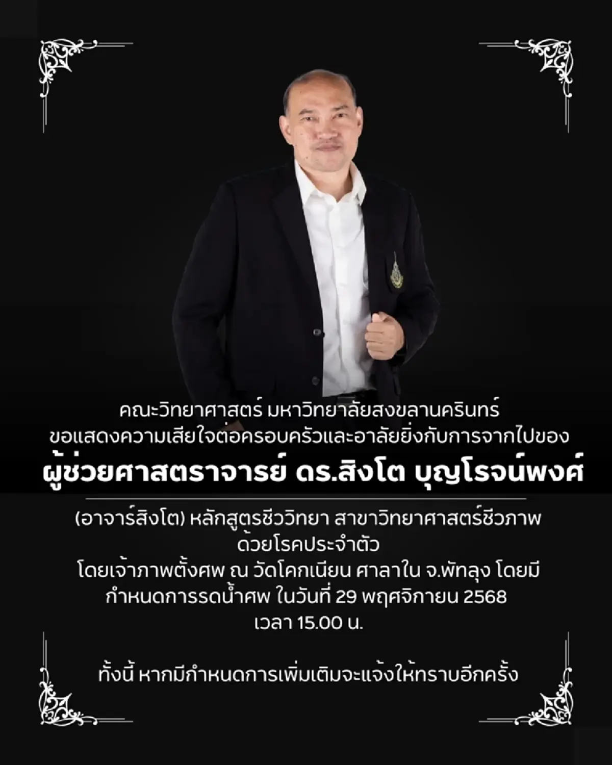 วันที่ 28 พฤศจิกายน 2568 คณะวิทยาศาสตร์ ม.อ. หาดใหญ่ ร่วมอาลัยการจากไปของ ผศ.ดร.สิงโต บุญโรจน์พงศ์ อาจารย์ผู้เป็นทั้งครู เพื่อน และแรงบันดาลใจของศิษย์ตลอดหลายปีแห่งการทำงานอย่างทุ่มเทและเมตตา พร้อมเผยกำหนดการพิธีทางศาสนา